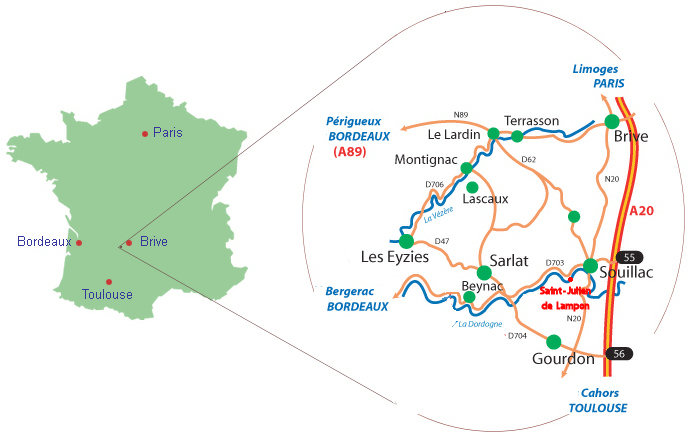 You can fly to Paris, Bordeaux, or Toulouse or some of the smaller regional airports like Brive, Limoges, Rodez or Bergerac, depending on your route. The train from Paris Austerlitz is a lovely and scenic experience and the quiet comfortable ride down just seems to fly by. There is also a TGV to Bordeaux, then picking up a rental car and driving east basically along the Dordogne for about 2.5 hours. If you are flying from the UK, then check with Virgin, Flybee and RyanAir.